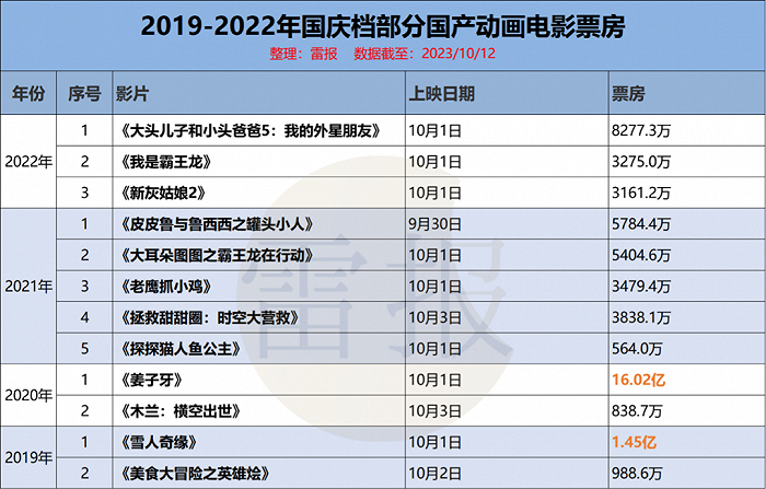 对比过去四个年度暑期档的国产电影票房,2019-2022年仅有2部国庆档影片票房过亿,分别是2019年的《雪人奇缘》(1.45亿元),以及2020年由光线影业、彩条屋、中传合道出品的《姜子牙》(16.02亿元)。往后的国庆档再未出现过票房过亿的国产动画影片。