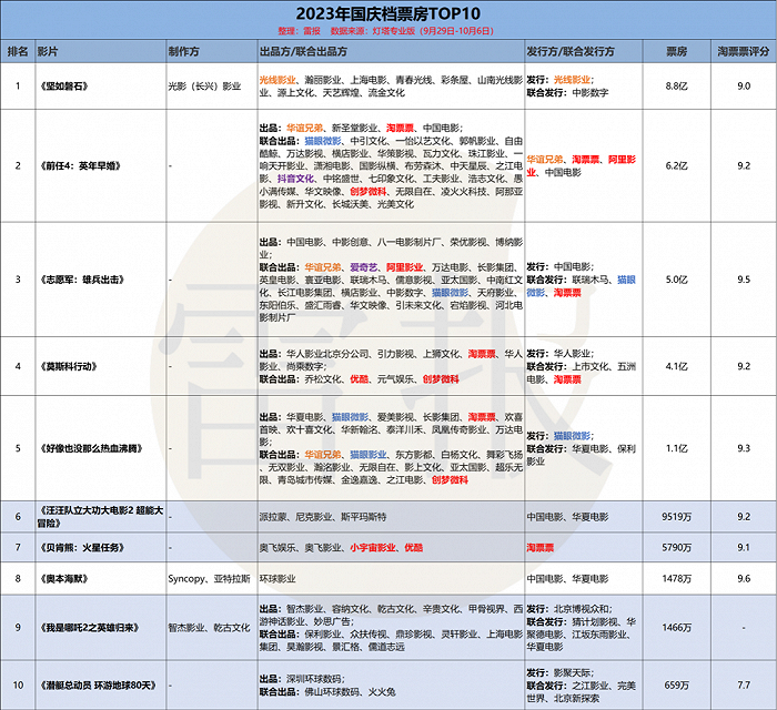 具体来看,截至 2023年10月6日24时,光线影业主控的《坚如磐石》累计票房收入最高,为9.98亿元;华谊兄弟则参投3部影片,其主控的《前任4:英年早婚》累计收入为7.1亿元。根据猫眼专业版对总票房的预测以及分账情况,大致可以估算,影片《坚如磐石》最终或将为光线影业带来超5亿收入,《前任4:英年早婚》则可能为华谊兄弟带来超1亿元的收入。