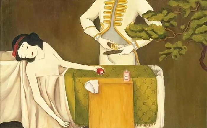 不过,这幅画在展出时,有观众向陈韦伶提出了另一层意思——他认为白雪公主是借装睡来吸引这个王子。
