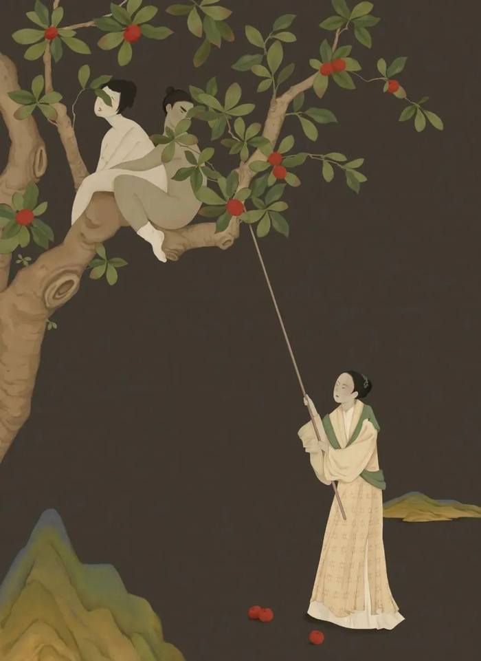2021年,陈韦伶又画了一棵苹果树。在作品《在苹果树上》中,树下的女孩好奇地用竹竿拨开树叶,背后是一对正在“偷食禁果”的男女。这幅画,是一个女孩对于性的好奇。要怎么正视对人性原始欲望的好奇?这个问题,留给教育者和家长回答更合适。