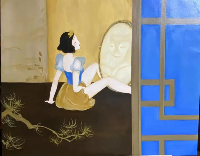 对于魔镜的这一行为,她有自己的理解。2022年,她画出了《白雪与魔镜》——白雪公主在自慰时,镜中的倒影是魔镜在窥视。