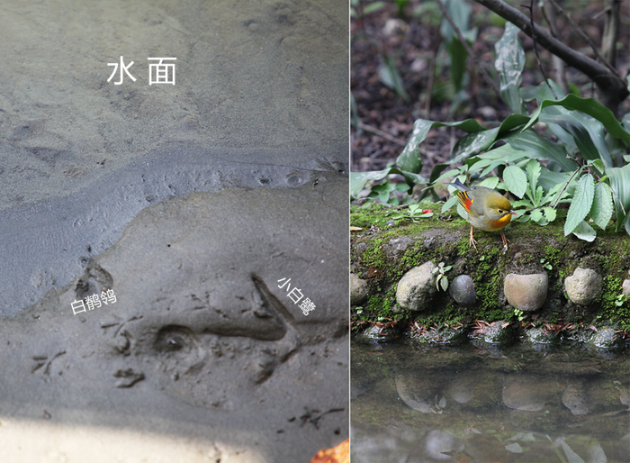 我们举一个很小的例子。来看看这幅河岸对比:左边是人类未碰过的,岸边有一些脚印,大脚印属于小白鹭,小脚印属于白鹡鸰,它们在水边活动,安全自在,想吃吃想喝喝,进可入水沐浴,退可展翅高飞。