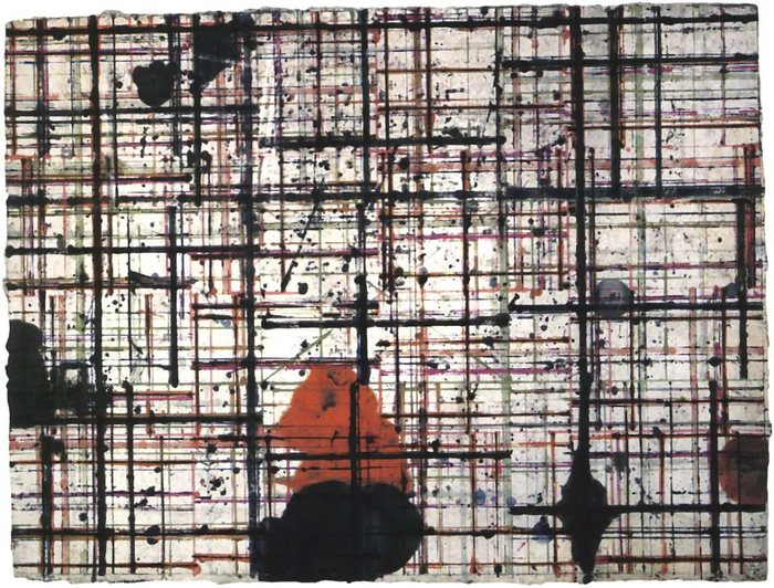 布莱斯·马登是一位画家,但我最喜欢他的一幅水墨纸本。这幅画印在了他于2006年在MoMA举办的回顾展的画册封底。简单来说,它是一个网格,也是一团凌乱——整张纸上没有一条连贯的线,上面布满了泼溅的墨点,就像是被另一幅未干的作品压在了下面浸染而成(也许这确实是它的制作方式)。如果是我碰见那张纸,我可能就是将其回收;而布莱斯·马登将它转化为一幅令人陶醉的画作。