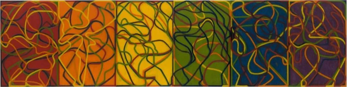 布莱斯·马登,《平面图像的吉祥园林,第三版》(The Propitious Garden of Plane Image, Third Version),2000-2006,亚麻布油画,六联画,182.9 × 731.5 cm