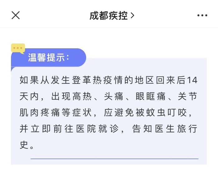 此前,成都疾控也发文提醒,如果从发生登革热疫情的地区回来后14天内,出现高热、头痛、眼眶痛、关节肌肉疼痛等症状,应避免被蚊虫叮咬,并立即前往医院就诊,告知医生旅行史。