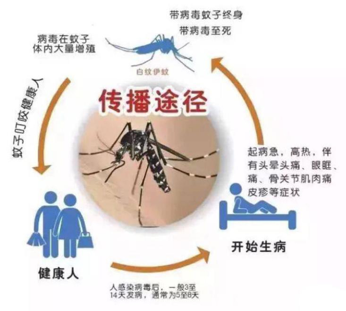 登革热主要通过伊蚊传播,在我国有白纹伊蚊和埃及伊蚊分布,其中白纹伊蚊分布更广泛,就是我们常看到的“花蚊子”。它们通常喜欢在有清水的地方繁殖,并且在白天活动。当伊蚊叮咬病人或隐性感染者时,将病毒吸入体内,并在体内经过8-10天增殖,再次叮咬后可将病毒传播给下一个人。