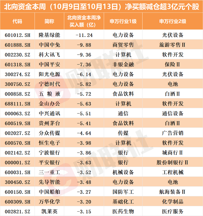 卖出方面,本周北向资金净卖出超3亿元的个股如下表。隆基绿能减仓额位居榜首,净卖出额为11.24亿元,中国中免、科大讯飞均减仓超9亿元。