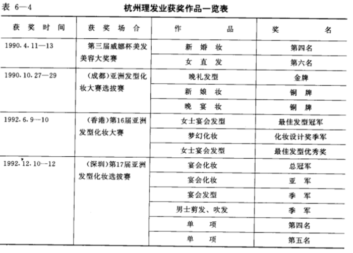 20世纪90年代杭州理发业获奖情况。来源/ 施锦祥主编;《中国城市综合实力五市强丛书·大庆市》编委会编《杭州市》,中国城市出版社1994年版
