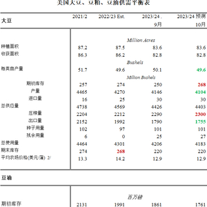 美国2023/24年度的大豆平均价格维持不变,在每蒲式耳12.90美元。豆粕和豆油价格为持不变,豆粕价格为每短吨380美元,豆油价格为每磅63美分。