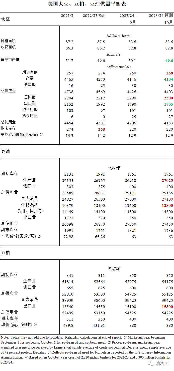 美国2023/24年油籽总产量预计为1.209亿吨,比上月的预测数据下调130万吨,大豆、棉籽、花生、油菜籽和葵花籽等油籽产量下降。预计美国大豆总产量为41亿蒲,因单产下调而减少4200万蒲。预计美国大豆收获面积保持不变为8280万英亩。预计大豆单产为每英亩49.6蒲,比9月份的预测下降0.5蒲/英亩。其中产量调整最大的是堪萨斯州、密歇根州和内布拉斯加州。由于产量的下调被期初库存增加所抵消,总供应量减少了2400万蒲式耳。同时巴西大豆的竞争加剧,预计美国大豆出口量下调3500万蒲式耳,至17.6亿蒲式耳。受豆粕出口和豆油美国国内需求增加的推动,美国国内大豆压榨量预计为23亿蒲式耳,增加1000万蒲式耳。由于出口减少被国内压榨量增加所抵消,期末库存与上月保持一致,为2.2亿蒲式耳。