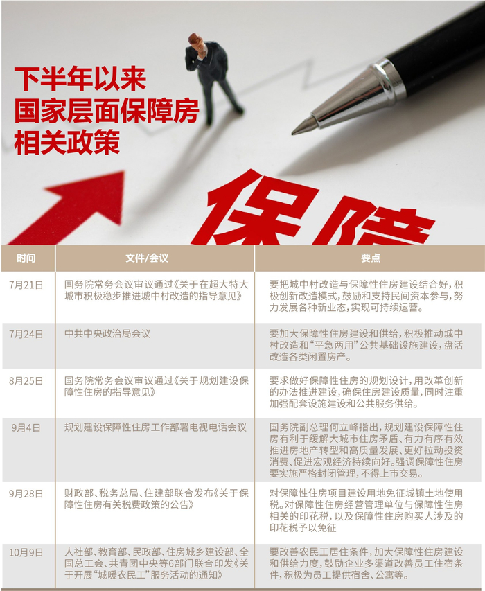 今年下半年,针对保障房建设的政策措施密集出台。8月25日,国务院常务会议审议通过了《关于规划建设保障性住房的指导意见》,要求做好保障性住房的规划设计,用改革创新的办法推进建设,确保住房建设质量,同时注重加强配套设施建设和公共服务供给。9月4日,在“规划建设保障性住房工作部署电视电话会议”上,国务院副总理何立峰指出,规划建设保障性住房有利于缓解大城市住房矛盾、有力有序有效推进房地产转型和高质量发展、更好拉动投资消费、促进宏观经济持续向好。强调保障性住房要实施严格封闭管理,不得上市交易。