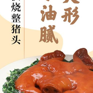 将猪舌头放在大圆盘中间,头肉面部朝上盖住舌头,再将腮肉、猪耳、眼球按猪头的原来部位装好,成整猪头形,浇上红糖汁,缀上香菜叶即成。