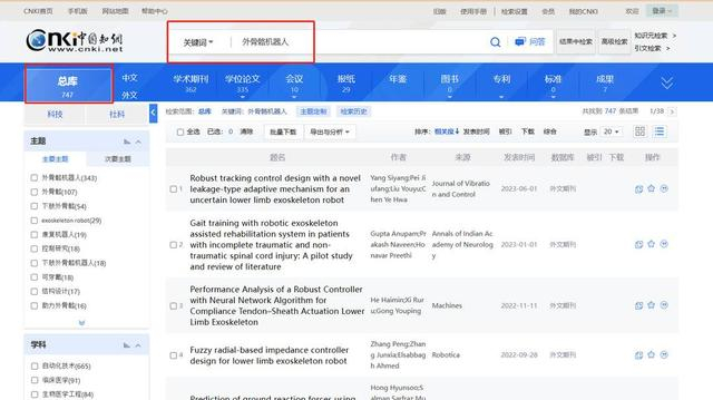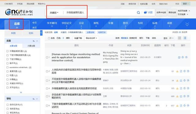 在中国知网以“外骨骼机器人”为关键词进行检索。