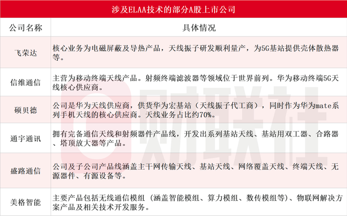 据不完全统计,涉及ELAA技术的A股上市公司主要有飞荣达、信维通信、硕贝德、通宇通讯、盛路通信、美格智能等,具体情况如下: