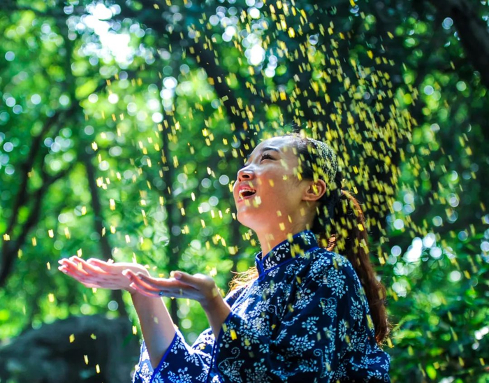 要是赶得早,在桂花源中还可以看到“打桂花”的特色活动!趁着晨光熹微,花苞还沾着露水的时候,几人合力撑开篷布,一人拿着竹竿敲落桂花,金色花雨纷纷而下,实在是都市难觅的享受。