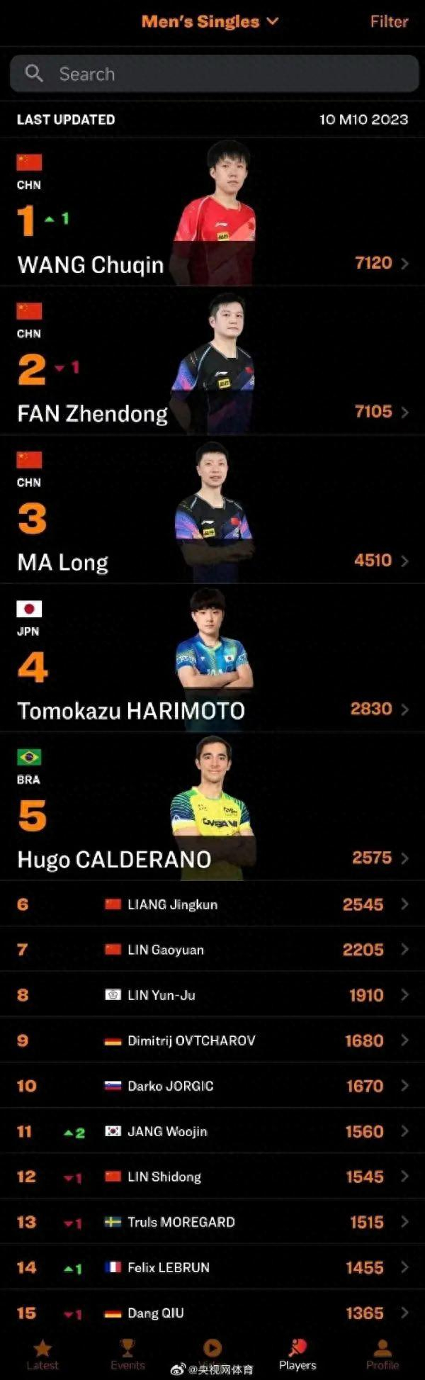 在前不久刚刚结束的杭州亚运会上,王楚钦成就四冠王,男单决赛更是4比3战胜樊振东首次摘得冠军。随后,国乒队出战WTT球星挑战赛兰州站,王楚钦又在男单决赛中4比2战胜马龙夺冠。凭借近期出色表现,王楚钦在国际乒联最新一期世界排名中重返男单世界第一,7120的积分领先樊振东15分。这是王楚钦继第27周首次成为世界第一后,今年第2次登顶。