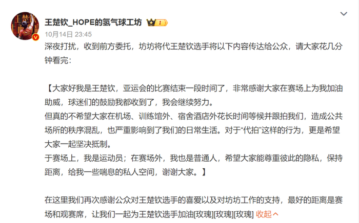 @王楚钦_HOPE的氢气球工坊 发文称