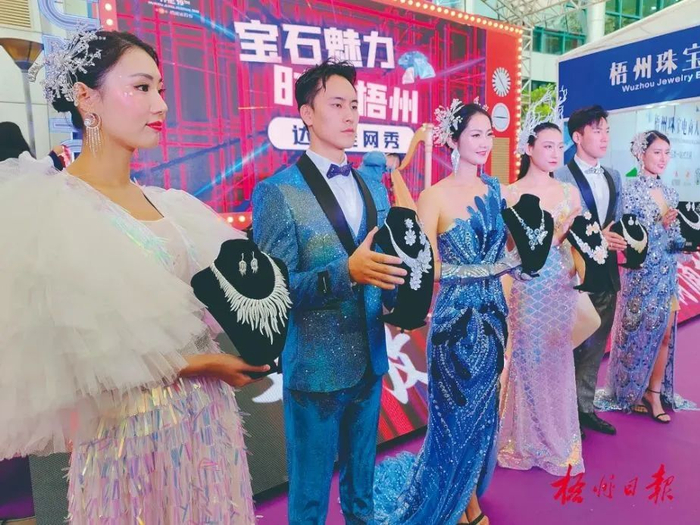 2022年11月25日,“宝石魅力 时尚梧州”达人全网秀中,模特集中展示各式宝石饰品。