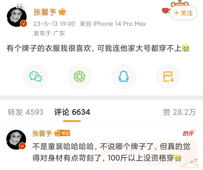 张馨予在社交媒体吐槽衣服尺寸