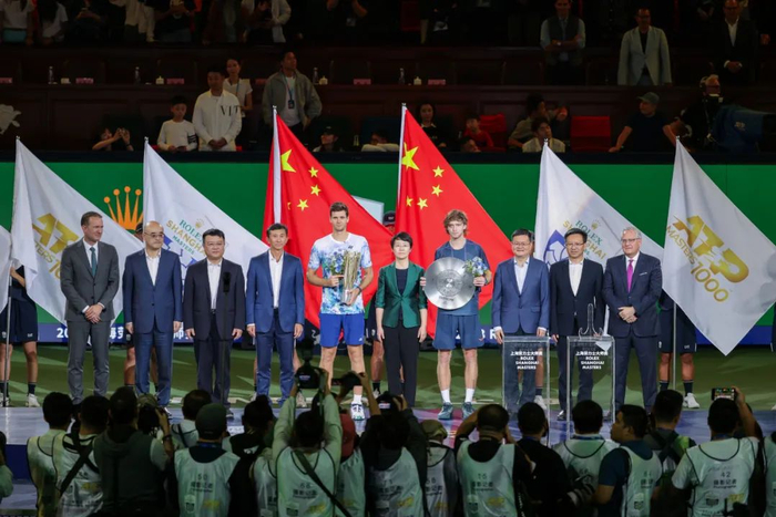 同时,这也是上海大师赛自2009年升级为ATP1000大师赛以来,继费德勒、德约科维奇、穆雷、达维登科和梅德韦杰夫后的第六位冠军。值得一提的是,瑞士名宿费德勒今天也出现旗忠网球中心,现场观战男单决赛。