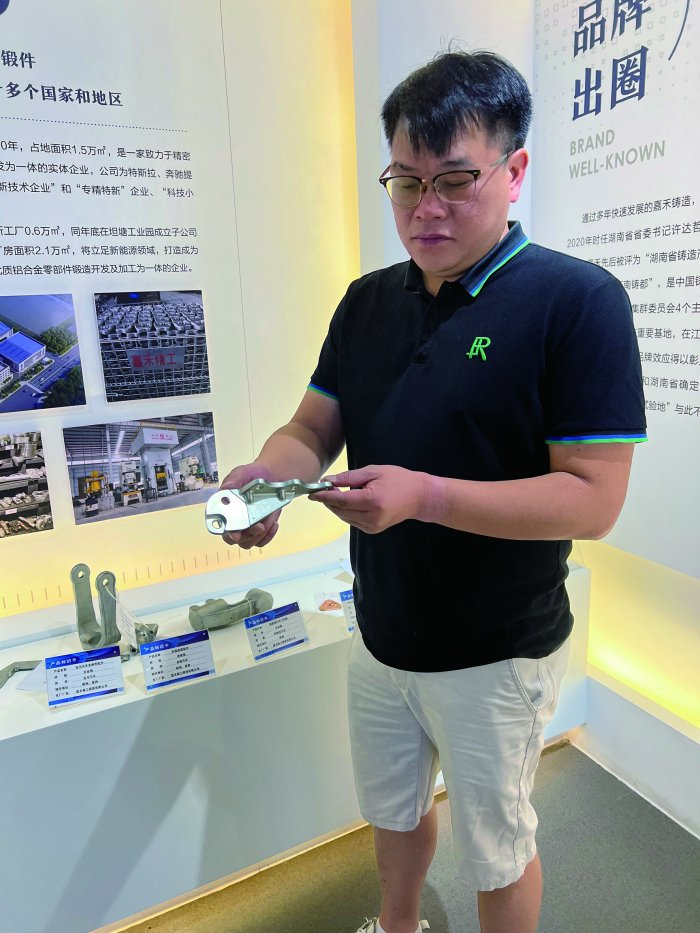 “这是特斯拉门铰链的部件,这是奔驰减震器的部件……都是区内的企业生产的。”展厅内,嘉禾经济开发区办公室主任刘建国给记者一一介绍。