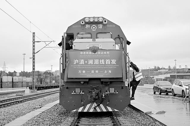 图片说明: 10月8日, 依托中老铁路、沪昆铁路打造的“沪滇·澜湄线”国际货运班列在昆明王家营西站举行首发仪式。(中新社)