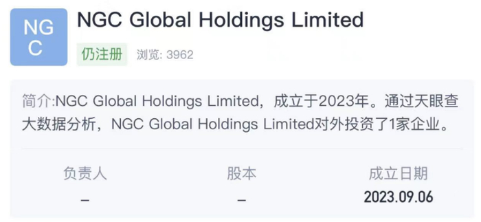 据资料显示,全新概念(三亚)投资集团有限公司成立日期为2023年9月25日,是一家以从事资本市场服务为主的企业,注册地址为海南省三亚市吉阳区迎宾路荣耀世纪大厦10楼1003号。该公司唯一的股东是一家香港公司:NGC Global Holdings Limited,于今年9月6日成立。