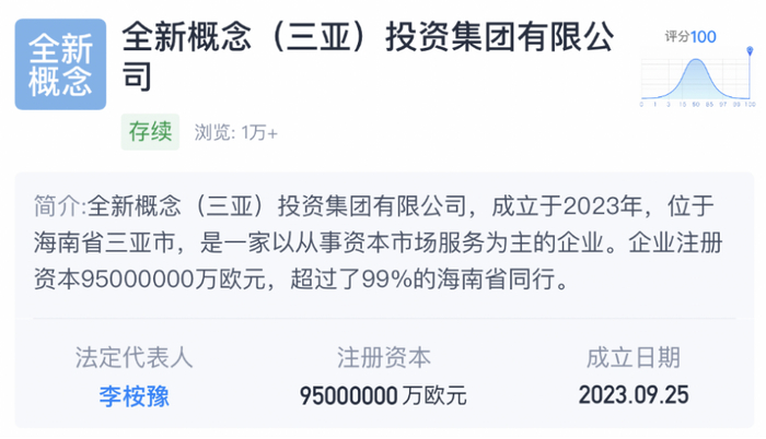 近日,一家名为“全新概念(三亚)投资集团”的公司引发关注,据天眼查显示,全新概念(三亚)投资集团有限公司的注册资本达9500亿欧元(约合人民币7.3万亿元)。