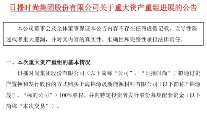 据日播时尚最新公告显示,公司拟从服装跨界到新能源,计划通过资产置换和发行股份的方式购买上海锦源晟新能源材料有限公司(以下简称“锦源晟”)100%股权。