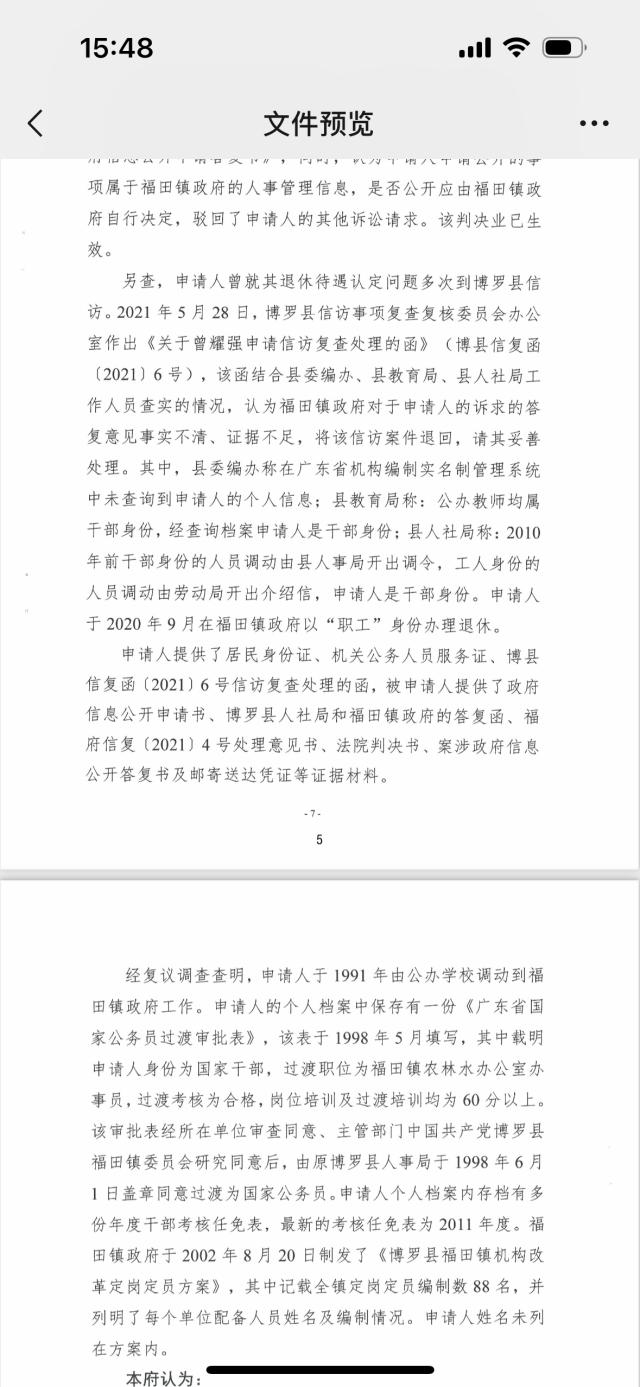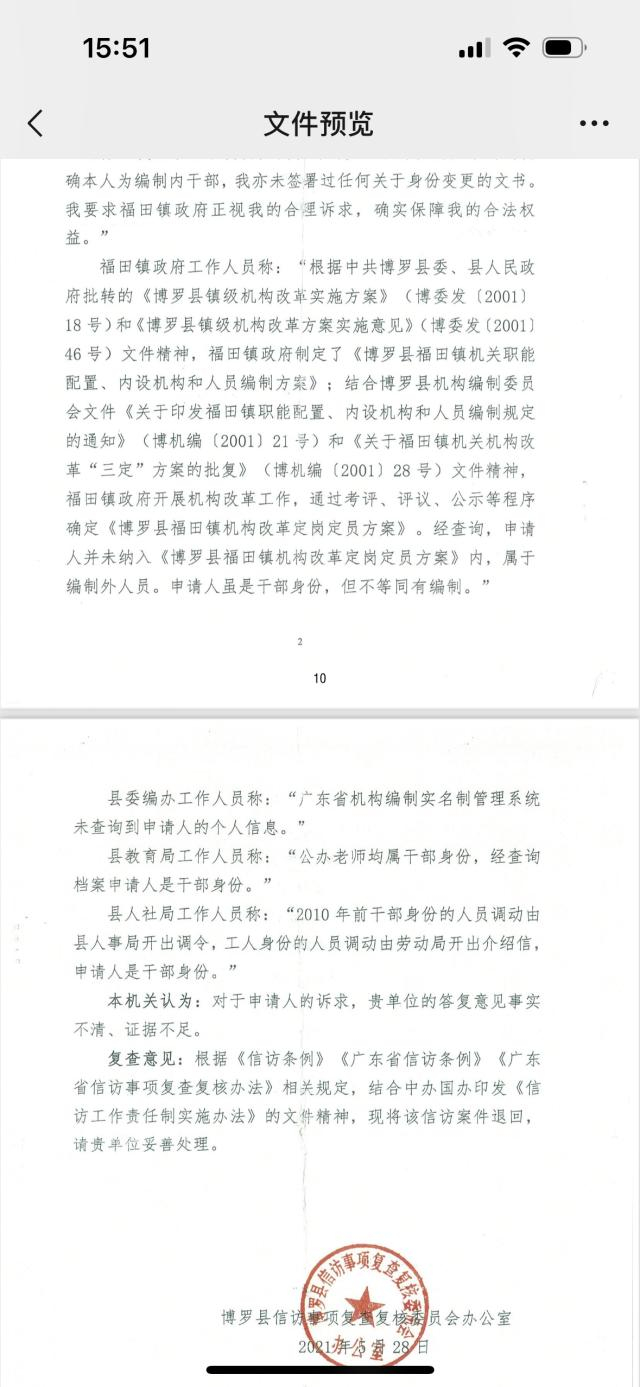 澎湃新闻注意到,博罗县信访事项复查复核委员会办公室于2021年5月作出的《关于曾耀强申请信访复查处理的函》显示,针对曾耀强反映的问题,博罗县教育局工作人员称,办公教师均属于干部身份,经查询档案曾耀强是干部身份;博罗县人社局工作人员称,“2010年前干部身份的人员调动是由县人事局开出调令,工人身份的人员调动是由劳动局开出介绍信,申请人(指曾耀强)是干部身份”。