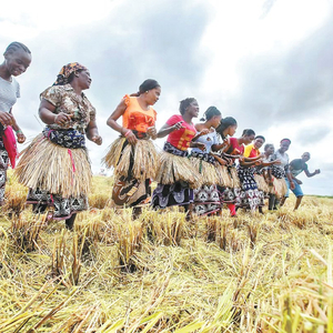 莫桑比克当地种植户在收获完的稻田里高兴地跳起草裙舞。 孙丽华摄
