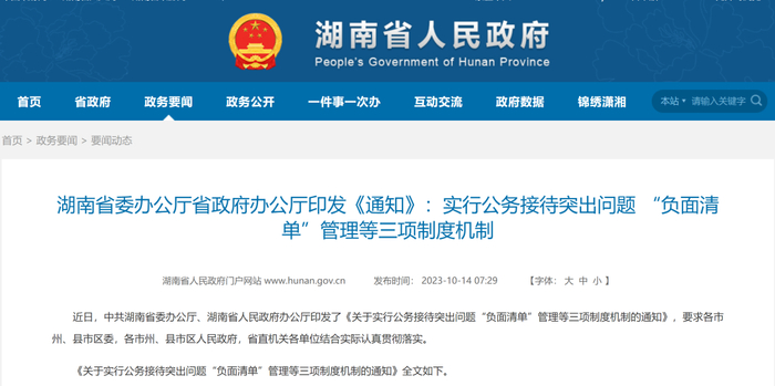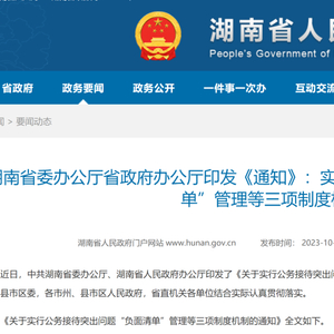 近日,中共湖南省委办公厅、湖南省人民政府办公厅印发了《关于实行公务接待突出问题“负面清单”管理等三项制度机制的通知》,列出了公务接待的23条突出问题“负面清单”。