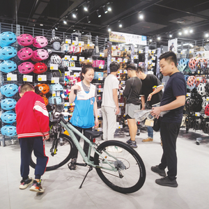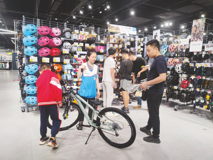 当天虽然是工作日,但店内自行车及骑行装备区仍有不少市民驻足。莫莉莉告诉记者,在今年的销售中,不少年轻顾客特别是初次接触自行车运动的,进店后会选择购买公路自行车,除了造型在感官上带来的不同,其适用路面也与城市骑行风向契合。