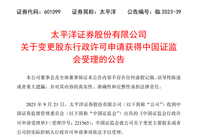 9月21日,太平洋证券与华创证券母公司华创云信同日发布公告称,证监会受理太平洋证券变更主要股东或公司实际控制人的行政许可申请。