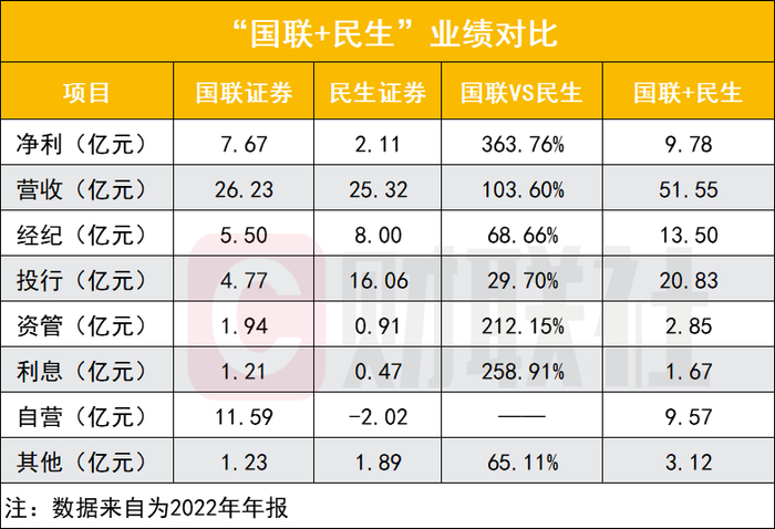 若两家券商完成合并,以2022年财报计算,“国联+民生”的净利为9.78亿元,将在上市券商中排名第23名,较国联证券当前排名提升3个名次;二者合并后的营收将达51.55亿元,排名同样是23名;二者合并后的业务条线及收入为经纪(13.50亿元)、投行(20.83亿元)、资管(2.85亿元)、利息(1.67亿元)、自营(9.57亿元)、其他(3.12亿元)。