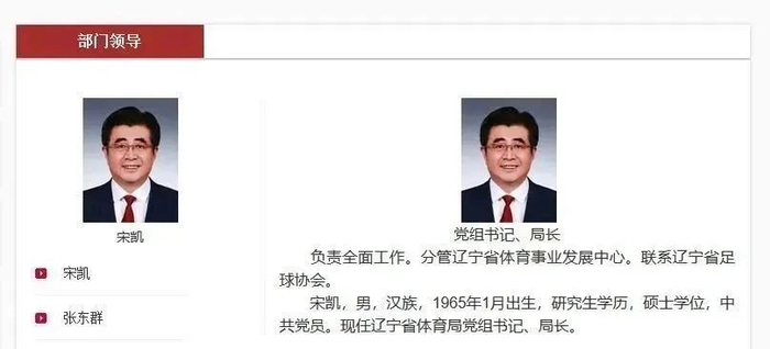 辽宁省体育局网站显示:宋凯负责全面工作。分管辽宁省体育事业发展中心。联系辽宁省足球协会。