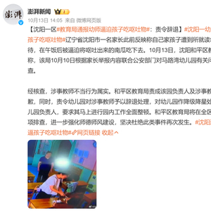 13日,针对“幼儿园老师逼孩子吃呕吐物”一事,沈阳市和平区教育局微信公众号“和平教育”发布通报:经核查,涉事教师不当行为属实。责令幼儿园对涉事教师予以辞退处理。