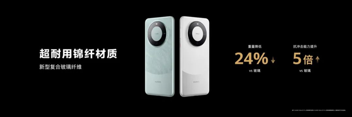 有了第二代昆仑玻璃还不够,华为继续研发出了超坚韧玄武机身和超耐磨锦纤材料,这才有了华为Mate60系列的超可靠玄武架构。超坚韧玄武机身让中框与背板底部实现了一体化连接,使手机抗挤压能力提升10倍,让整机更不容易变形,而且还能兼顾重量与手感。而通过对超韧、超轻新型复合玻璃纤维材料的运用,华为还带来了全新的锦纤材质,使背板抗冲击能力提升了5倍。
