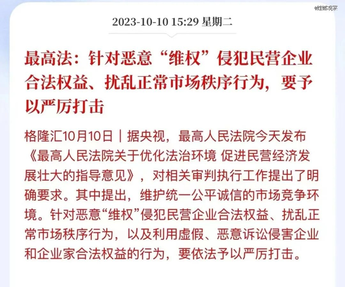 最近,最高人民法院又发布了《最高人民法院关于优化法治环境 促进民营经济发展壮大的指导意见》,明确指出了“以及利用虚假、恶意诉讼侵害企业和企业家合法权益的行为,要依法予以严厉打击”。