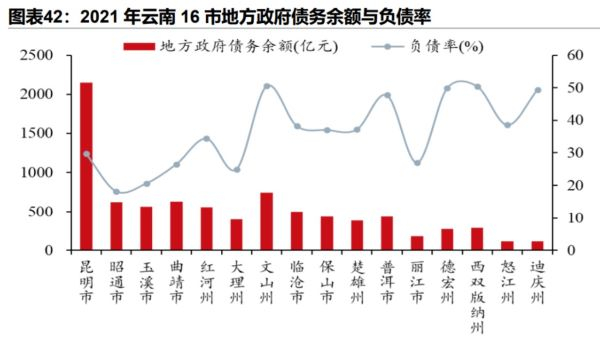 粤开证券首席经济学家罗志恒认为,云南省总体债务负担较重,考虑城投平台形成的有息债务后,广义负债率超过100%,且隐性债务融资成本较高,化解难度较大。考虑融资平台有息负债之后,截至2021年底昆明、昭通、保山等市广义负债率居前,超60%。