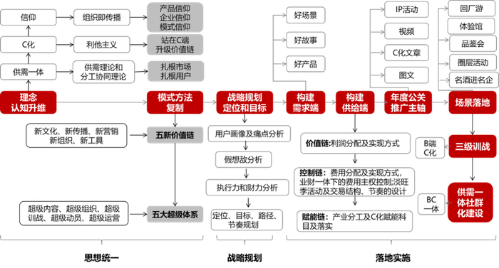 所以,口碑品牌的打造是复杂的。它是从一种严肃深刻的思想理念出发,在既定成熟的模式范式下,建立C化导向的战略体系,并在此基础上,从供需两侧构建匹配口碑传颂的价值链体系和运营体系,并日复一日在用户现场持续迭代产品和服务体系,以此强化企业和用户之间的关系。如下图所示: