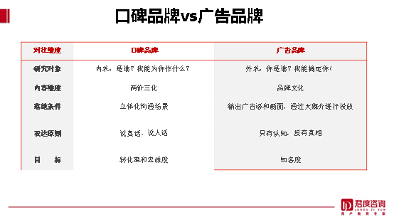 它不是简单研究用户心智的一个品类定位,它是回到自我价值、感人至深的系统描述。在价值塑造层面,无论是研究对象、内容维度、落地实施条件,还是表达原则、实施目标等,口碑品牌和传统的广告品牌相比存在巨大差异,甚至二者方向向左。具体如下: