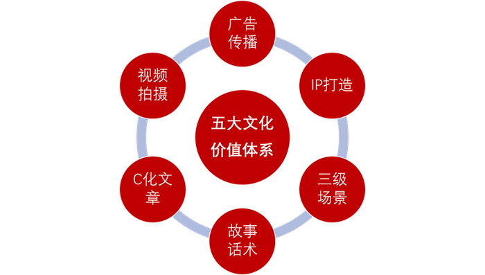 价值传递——新传播,是龙翼。不同于传统广告对品牌的塑造方式,口碑品牌更需要全方位、立体化的传播表达,尤其是在内容社交货币化加持下的口口传颂,口碑品牌体系称之为“新传播”,它是价值链的“龙翼”,它需要以新文化的价值塑造和价值挖掘为前提。只有系统挖掘出企业的物质价值和精神价值,品质文化、企业文化和品牌文化主动传颂的发动机方可以启动,它包括三级训战、三级场景、短视频、C化文章、IP活动甚至广告语——空中广告语需要从中提炼以形成“地空一体”的一致性,如下图: