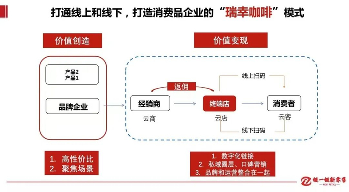 价值变现——新营销,是龙爪。传统营销是以B端渠道为核心进行利益设计和资源配置的,这种模式在传播拉动有效的环境下是符合产业分工原理的,广告承担拉力,渠道承担推力,推拉结合打通供需两端。但在产品过剩、媒介过剩、传播失效的背景下,以B端为核心的传统营销面临困境,会出现两个问题:一是渠道价格难以维系;二是市场费用主权失控。前者是果,后者是因,这会扭曲价值链,让企业增长难以持续,这种价值链失序往往是口碑放大的障碍,有时甚至是负面口碑的来源。