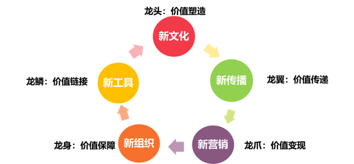 价值保障——新组织,是龙身。所有的模式如果不能在组织层面进行表达,将无法绽放生命力,口碑营销的五新价值链模式也是需要对应组织的配套。和传统营销相比,口碑营销在组织上有两个变化,一是企业总部的中台化组织,二是以用户关系为导向的厂商店产业化组织分工。