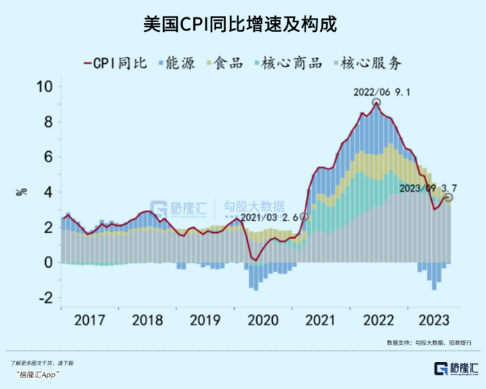 10月12日,据官方披露,美国9月CPI季调环比增长0.4%,同比3.7%,与上月持平,高于市场预期的3.6%。核心CPI季调环比0.3%,同比4.1%,与市场预期一致,较上月小幅放缓0.2个百分点。