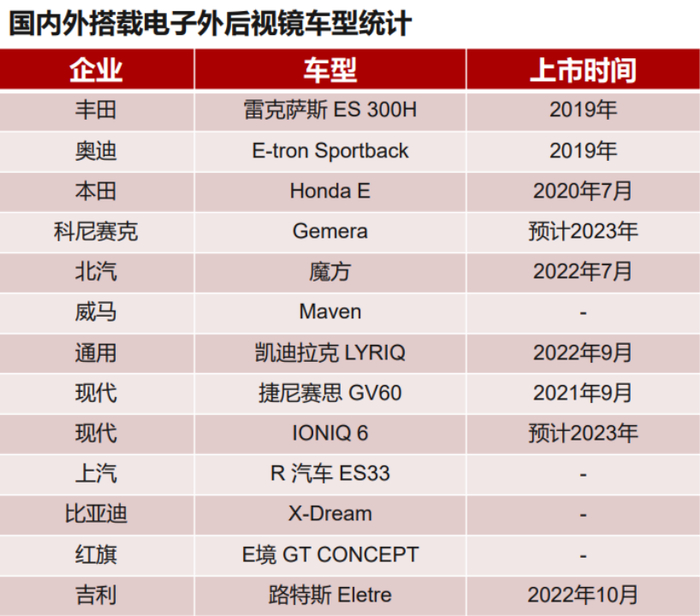 国内新国家标准(GB 15084-2022上)《机动车辆间接视野装置性能和安装要求》7月1日正式开始实施,其中新增了“摄像机-监视器系统”、“视镜和CMS双功能系统”等内容,为国内电子后视镜“上车”扫除障碍。因此,今年也被视为国内开启电子外后视镜量产元年。