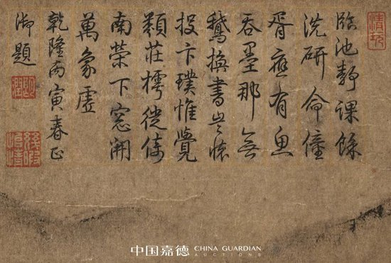 乾隆御览之宝、乾隆鉴赏、石渠宝笈、三希堂精鉴玺、宜子孙、石渠定鉴、宝笈重编、淳化轩图书珍秘宝、淳化轩、乾隆宸翰、信天主人、太上皇帝、清玩、朗润、几暇怡情