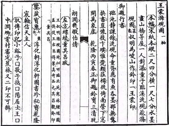 “宋纸本,纵二尺四分,横一尺七分。水墨画山桥茅屋,一人对瀑,童子临溪洗砚。款:涤砚图。(篆书)叔明为嵕山作。钤印一:王蒙印。御题行书 (略)。左方缥绫,董其昌跋:王叔明涤砚图,绝似所临北苑寒林钟馗图,盖俱从王右丞得笔,真奇品也!其昌观。钤印一:董其昌。鉴藏宝玺 (略),收传印记 (略)。(谨按嵕山乃余谦字,池阳人。官江浙儒学提举。善草隶,见 《书史会要》。)”