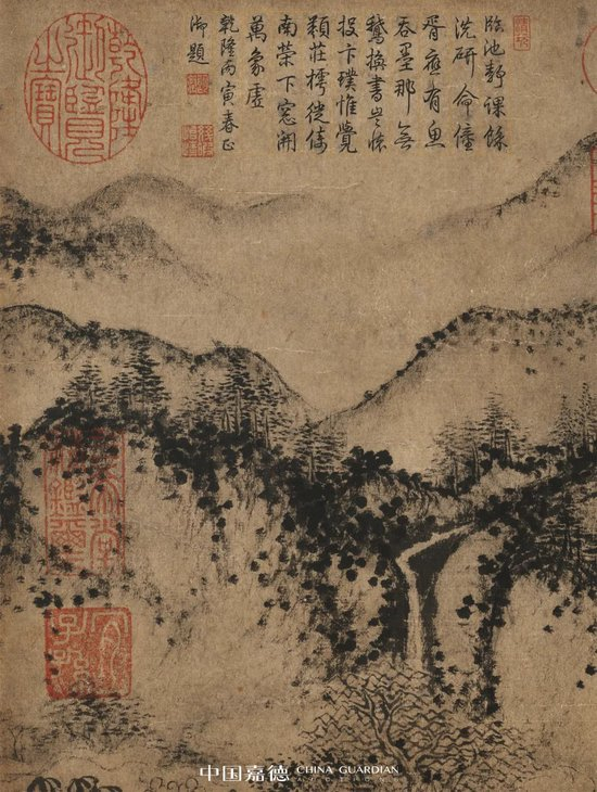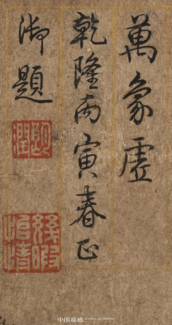 是幅王蒙 《涤砚图》曾为清宫旧藏,著录于 《石渠宝笈续编》“淳化轩”中,是目前所见,海内外公立机构之外,唯一可于市场流通的 《石渠》著录王蒙立轴珍品。画幅之上,载有乾隆帝藏印计十五方,并有乾隆帝行书题写五言诗,诗文见于 《御制诗文集》。最为难得的是,题诗前乾隆帝特命人于画幅上方绘制金丝栏,而后一丝不苟题诗于其间,这在公私所见诸多乾隆帝御题中,是极为罕见的。